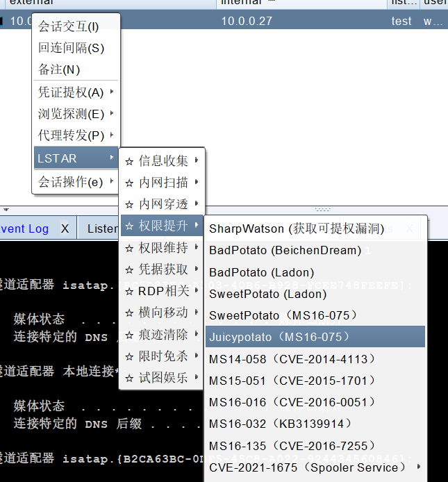 使用插件提权(很多的插件都有权限提升的功能,可多次尝试) 提权成功之后,会多出一条system权限的会话。
