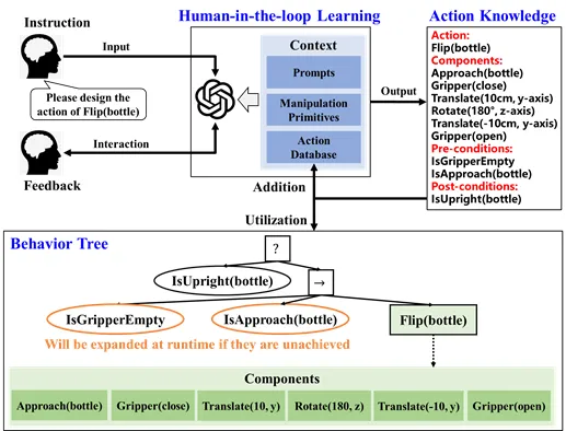 当应用于超出BT Planner能力范围的新任务时,则需要具备增量学习能力。强化学习需要大量的训练和精心设计的奖励函数;模仿学习需要大量的专家示范数据;无监督学习可能导致结果偏离预期。一种新颖的方法是使用LLM来学习机器人操作。