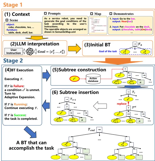 许多研究已将LLM应用于机器人,以实现指令执行任务,例如SayCan、RT-2、VoxPoser等。然而,这些方法需要反复调用LLM来处理外部干扰,这是一个非常耗时的过程。机器人领域的一个活跃研究方向是将LLM与行为树(Behavior Tree, BT)相结合。LLM被用于将用户指令解释为包含任务目标条件的行为树。当外部干扰导致BT中的条件无法达成时,行为树规划器(BT Planner)会基于动作数据库(Action Database),迭代地将未达成的条件扩展为子树,旨在通过执行动作来达成这些条件。尽管这些方法能够以较少的LLM调用次数处理外部干扰,但动作数据库是人工预先构建的。