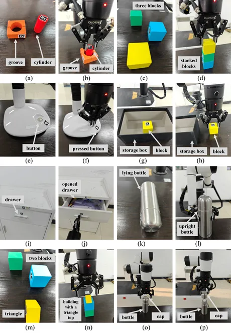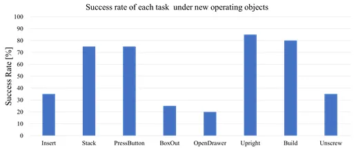 这表明该动作知识具有良好的适应性,且大多数任务失败是由于视觉系统的识别偏差造成的。为了研究所生成动作知识的泛化能力,为这8项任务设计了新的操作对象。生成的动作知识在Stack、PressButton、Upright和Build任务中的成功率超过 70%。这是因为动作知识中的MPs参数适用于新的操作对象。然而,在Insert、BoxOut、OpenDrawer和Unscrew任务中成功率低于 40%。这是因为动作知识中的MPs参数不适用于新的操作对象。如果在将生成的动作知识应用于新的操作对象之前对其进行微调,则可以进一步提高任务的成功率。总的来说,本文提出了一种人机交互学习机制,核心在于生成可直接应用于机器人自适应操作的动作知识,并通过上下文学习实现,无需知识迁移。多项实验结果表明,该方法能够提升机器人的学习性能,使其能够完成任务并应对外部干扰。