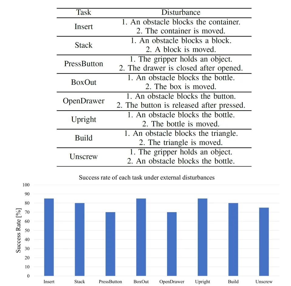 基线方法使用 LLM 基于上下文和动作数据库生成动作知识,但没有人机交互学习,而所提方法最多可以提供3次交互反馈。使用两种 LLM(DeepSeek-V3和 ChatGPT-4o)进行测试。在这 8 项任务中,所提方法的学习性能优于基线方法。通过人机交互修正动作知识,所提方法在这 8 项任务中的成功率超过 80%。为了验证所生成动作知识的适应性,为这8项任务设计了外部干扰。所提方法所获得的动作知识在这8项具有外部干扰任务中的成功率超过70%。