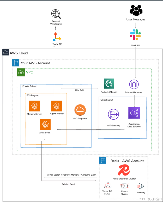 - 部署在 AWS 上的 Redis Cloud:存储记忆、管理事件队列、为检索增强生成(RAG)提供向量搜索能力。