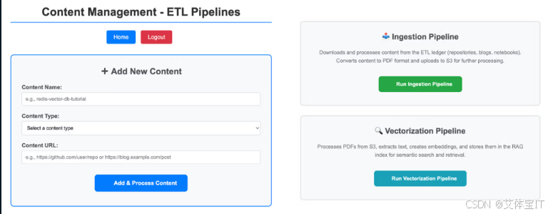 图 3:内容管理后台面板,展示了 Redis 知识源的摄取和向量化管道。