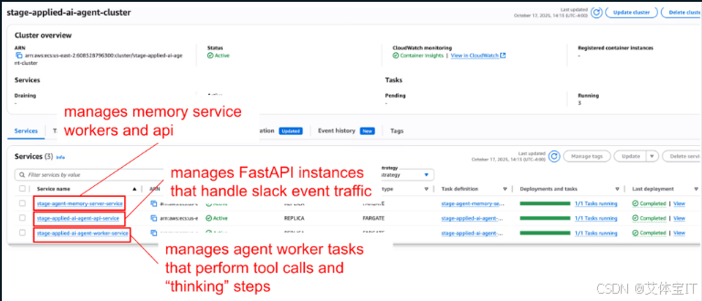 - ECS Fargate:运行包括 API 和智能体工作程序在内的容器化服务。