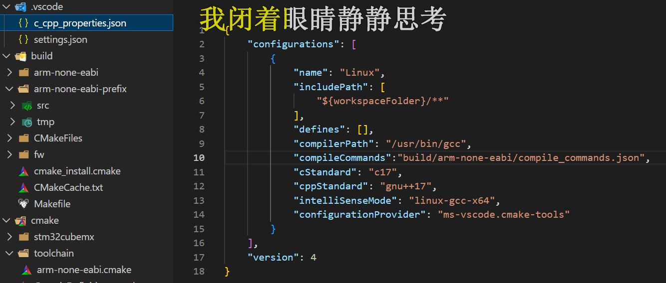 歌词请忽略,在c_cpp_properties.json 文件里配置项添加compileCoommands项目 指明compile_commands 文件位置,这样就不用刻意去告诉vscode文件在哪里,他自己会查。这个只是方便vscode查看代码,编译还是用cmake,不用vscode编译,因此其他选项不用管。