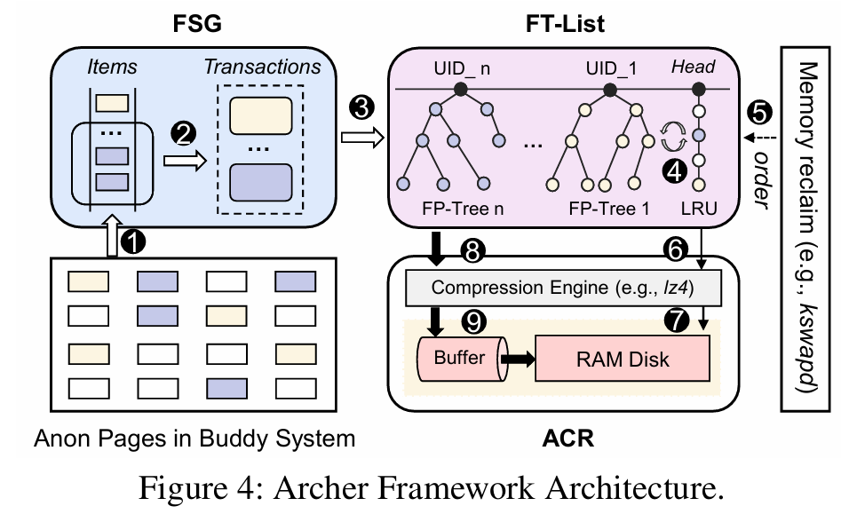 这种融合结构使得Archer能够灵活地切换压缩策略。在常规使用中,Archer进入传统页面回收LRU路径,直接从链表中回收非活跃页面并逐页压缩。当遭遇突发内存需求时,系统从头到尾扫描FT-List,选择关联页面进行打包压缩。
