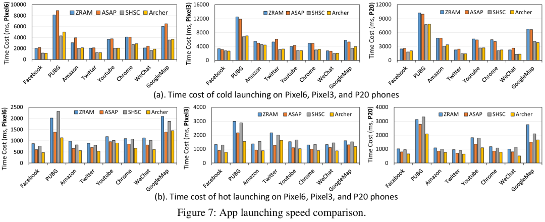 将Archer与原始Linux内存压缩机制以及移动系统中的最先进方案进行对比评估,实验在Google Pixel6 Pro、Pixel3和华为P20上进行。