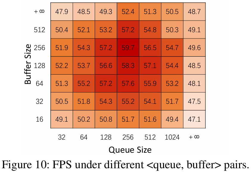 ③敏感性研究 **:**Archer的性能受关联挖掘参数影响较大。图10显示了在Pixel6上不同队列和事务缓冲区大小下的评估结果。当结构大小适中时,帧率随尺寸增大而优化。但尺寸继续增大后,帧率反而下降。综合内存与计算开销,不建议设置过大尺寸。Archer的效果还受滑动窗口宽度(w)、超时阈值∆T、关联规则置信度等参数影响,建议针对各移动设备定制化配置Archer。