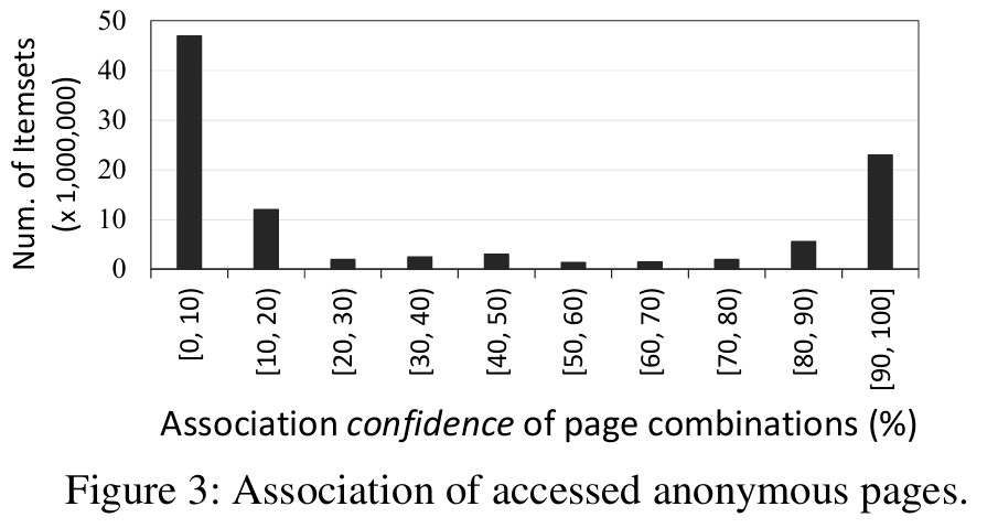 如图3所示,分析流行应用的页面访问足迹发现,大约四分之一的匿名内存页之间存在高度相关性,通过挖掘内存页面之间的关联规则,并将高度关联的页面一起压缩,可以在突发内存需求场景下显著提升系统响应速度,同时最小化读取放大。