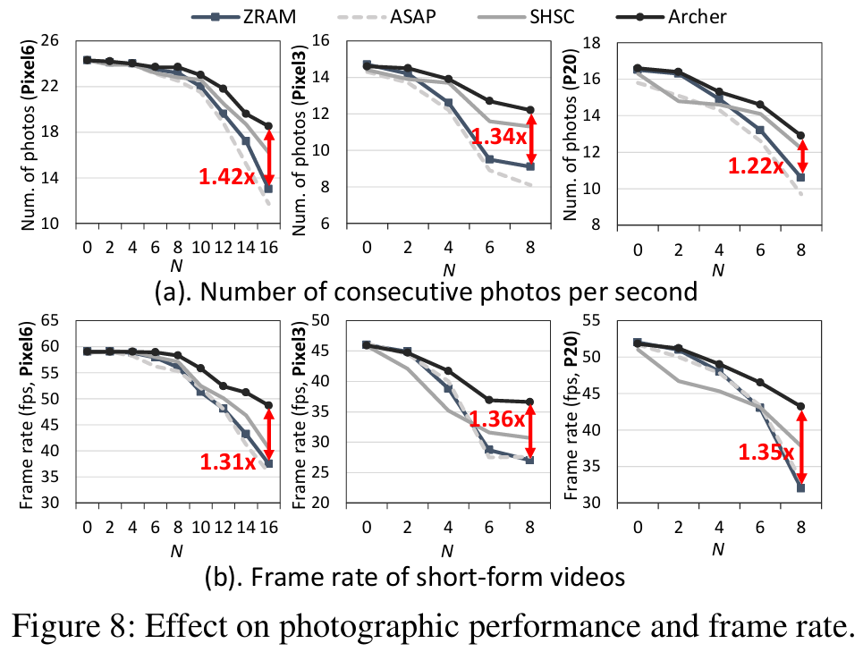 **②拍照性能与帧率:**如图8所示,启用Archer后,系统在内存压力下的性能得到大幅改善,Pixel6、Pixel3、P20拍照速度分别提升1.42、1.34、1.22倍,Pixel6、Pixel3、P20短短视频帧率分别提升1.31、1.36、1.39倍。