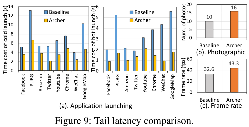 **③对尾延迟的影响:**如图9所示,尾部延迟(即每个用例十轮测试中最差情况)显著降低,如在Pixel6上,应用程序的冷启动尾延迟减少44.9%,热启动减少60.3%,连拍和帧渲染的最差性能分别提升1.6倍和1.3倍。