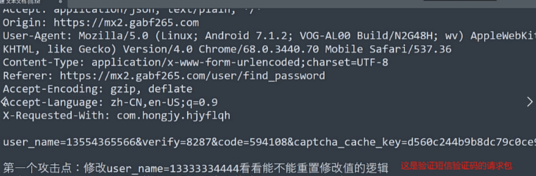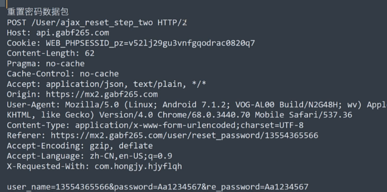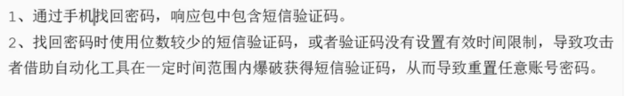 当我们输入正确的手机号和正确的短信验证码,然后进入重置密码的最后一步,也就是输入新的密码,输入密码后提交到服务端的post数据包需要包含当前用户的身份信息。而一般网站是通过用户名或用户ID来标识用户身份的,如果这个用户名或用户ID没有和当前手机号、短信验证码进行绑定。也就是说服务端只验证用户名、ID是否存在,而不去验证用户和当前手机号是否匹配,那么我们就可以通过修改用户名、ID去修改其他用户的密码了。当然可以修改的地方不限于找回密码的数据包,比如修改资料的地方也可能存在这样的漏洞。