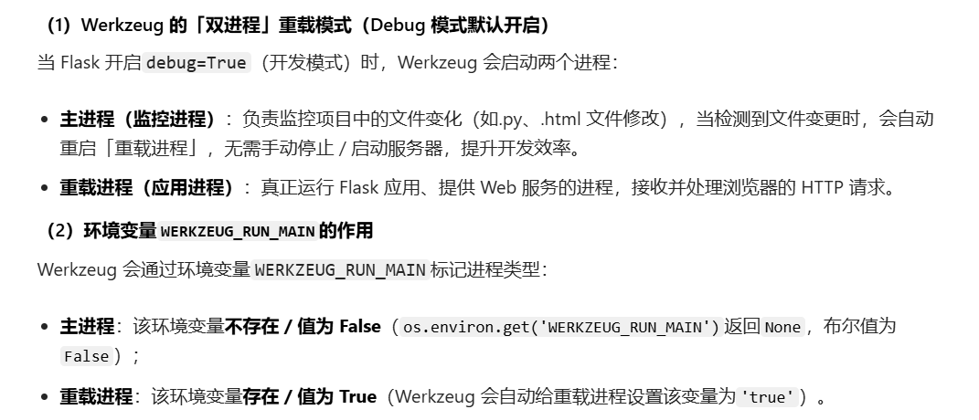 这里就直接判断,根据上面的资料os.environ.get('WERKZEUG_RUN_MAIN')返回值可以确定是哪个进程,一个true,一个false