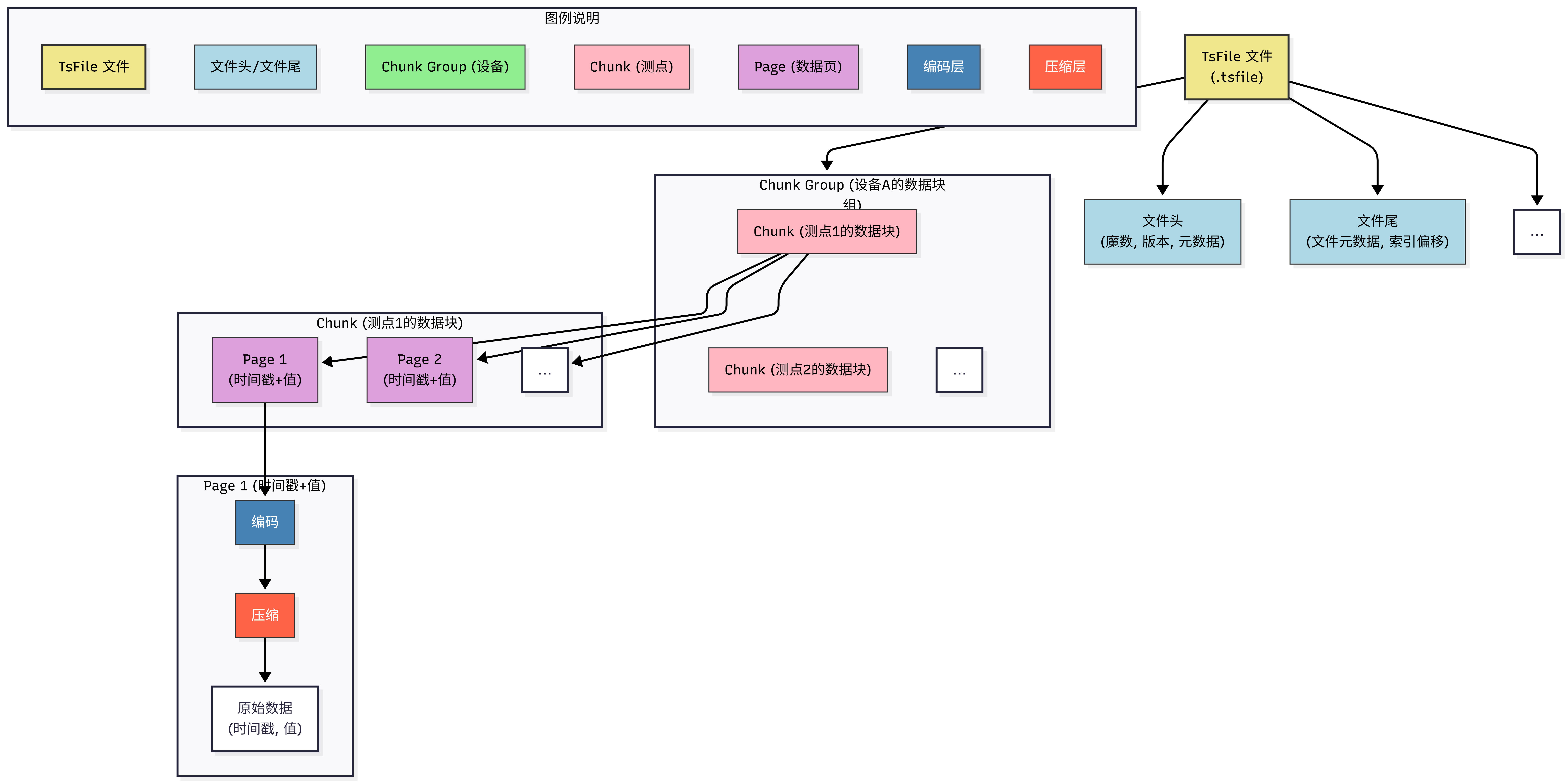 - TsFile:专为时序数据打造的存储格式。 IoTDB 放弃通用的存储引擎,而是自研高效的 TsFile 存储格式。TsFile 专门针对时序数据的特性进行了深度优化。能把同一时间序列的数据紧密存储在一起,并采用多种高级压缩算法,实现极高的压缩比。