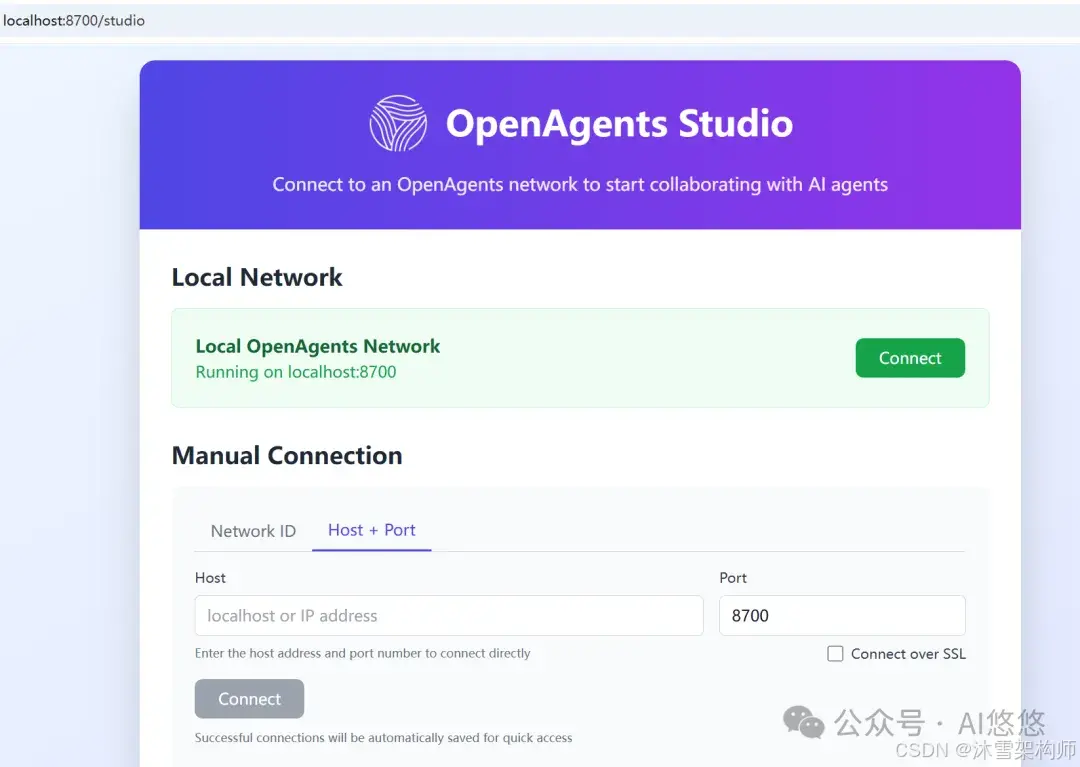 - 启动智能体时,指定网络主机为localhost,端口为8700。