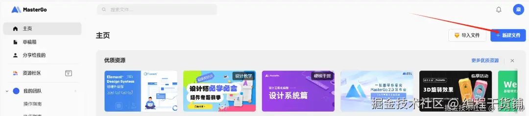 - 登录 MasterGo 官网,点击右上角【新建文件】