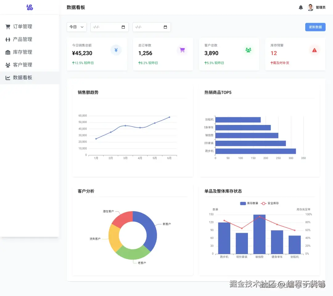 健身器材后台:包含登录页、订单管理(搜索、筛选)、产品管理、销售统计看板