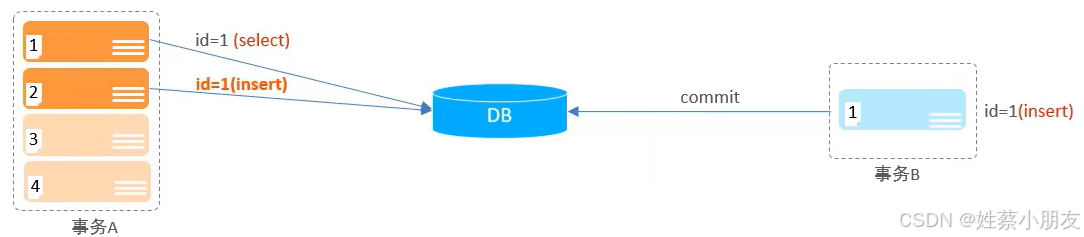 - 不可重复读 :一个事物先后查询 同一条记录,由于另一个事务的更新 操作导致两次读到不同的数据。例如:事务A先后读取同一数据,但是在两次读取之间事务B修改了数据,导致事务A两次读到的数据不一致。