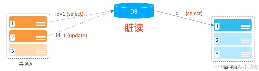 - 脏读 :一个事物读取到另外一个事物还没有提交的数据。例如:事务A执行update,但在commit前事务B就读取了数据,那么事务B读到的就是脏数据。