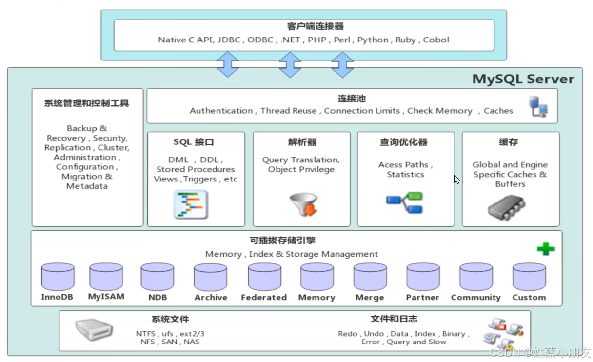 - 服务层 暴露统一接口检查并处理SQL、存储过程、视图、触发器,生成引擎能理解的指令序列。