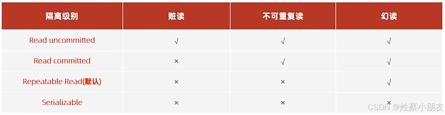 - 隔离性要求同一事务在多线程下串行执行无并发安全问题,属于线程之间对该事物的操作不能相互干扰。