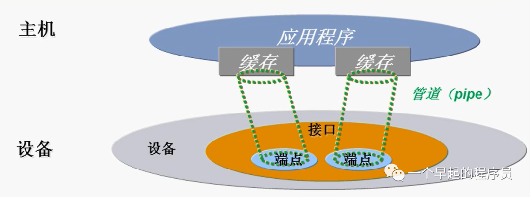 一个接口完成一种功能,每种接口(功能)配有1个或者多个端点。 端点是主机与设备之间通讯数据的接收或来源,要实现通讯功能,接口必须有端点的配备才可以,主机要给设备发送数据,端点就是数据的接收器,主机要给设备要数据,端点就是数据的发送器,然后通过多个端点配合接收和发送各种数据实现某个接口的某种功能。所以大家注意了,端点的依附于接口上的。其实一个端点就是一段存放接收和发送数据的缓冲区。这段缓冲区有一定的属性,在USB设备中,我们用端点描述符来描述这段缓冲区的属性。后期看代码。