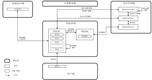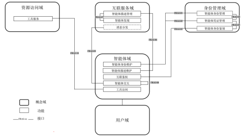 - 身份管理域:身份管理域是智能体互联中智能体身份管理、智能体凭证管理和智能体身份鉴别的功能集合,为智能体互联中智能体的身份等相关信息的提供管理服务。