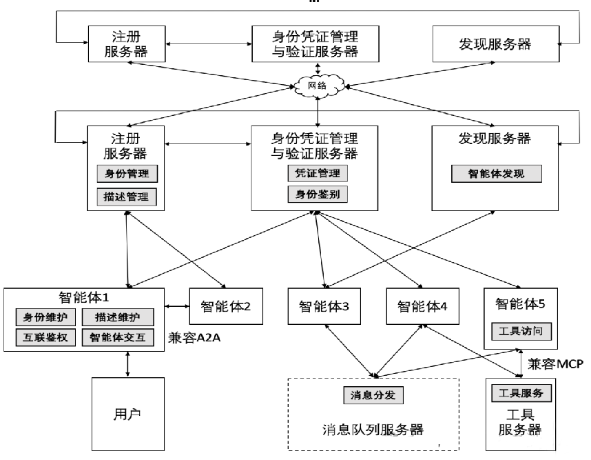 - 在一个智能体互联自治域内,采用集中式服务器方案实现管理实体(注册服务器、身份凭证管理与验证服务器、发现服务器),这种方案可以提供更好的可管理性和运行效率;