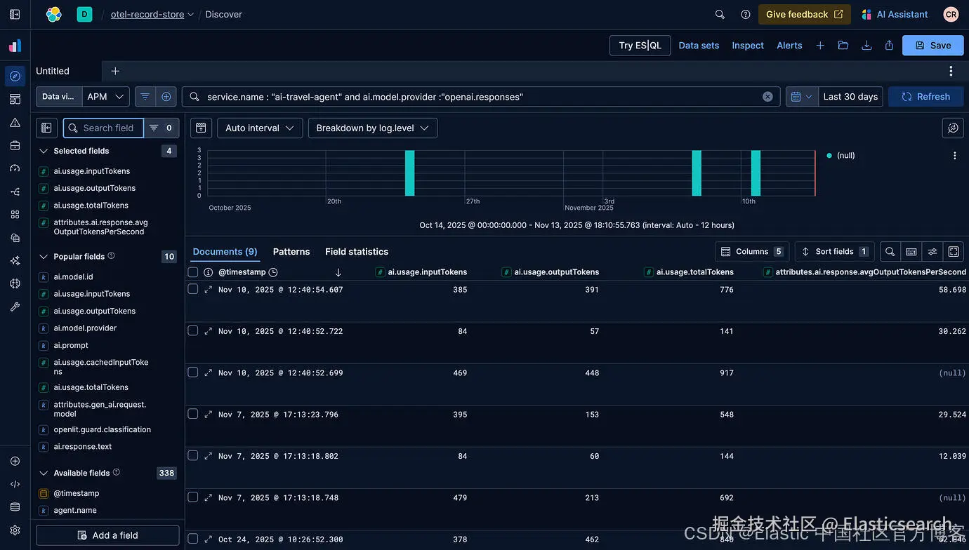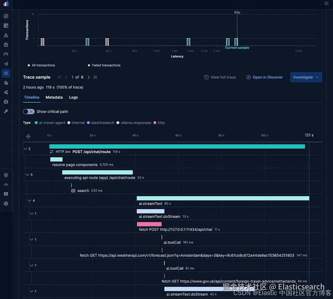另一个特定于我们 AI SDK 埋点的细节是,我们需要通过 experimental_telemetry: { isEnabled: true } 启用遥测数据的生成。结合这两组配置,OpenLit 将生成 traces ,展示我们应用中不同的工具调用,以及对 Elasticsearch 的关键请求,用于持久化我们的语义记忆。