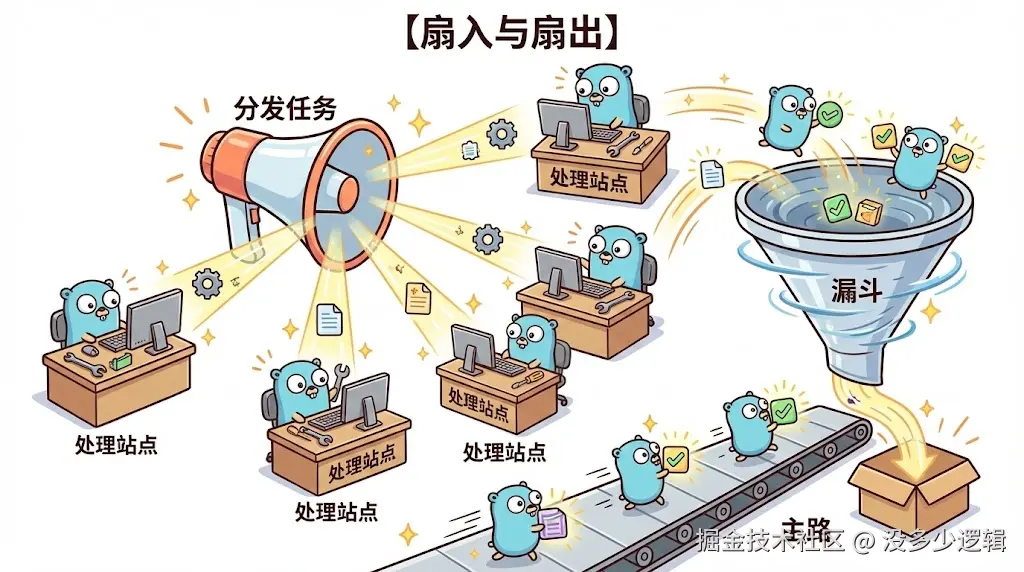 它是什么? 扇出 :将任务分发给多个 Worker 并行处理。 扇入:将多个 Worker 的处理结果汇聚到一个 Channel 中。