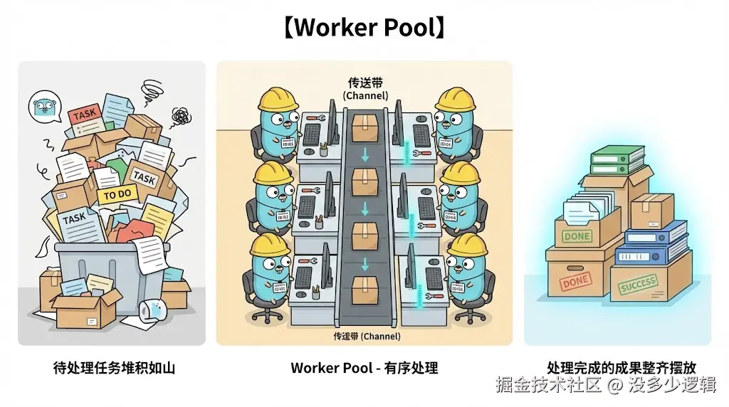 为什么需要它? 如果不加限制地启动 Goroutine,可能会耗尽 CPU 或内存,把下游服务打挂。Worker Pool 让并发量可控。