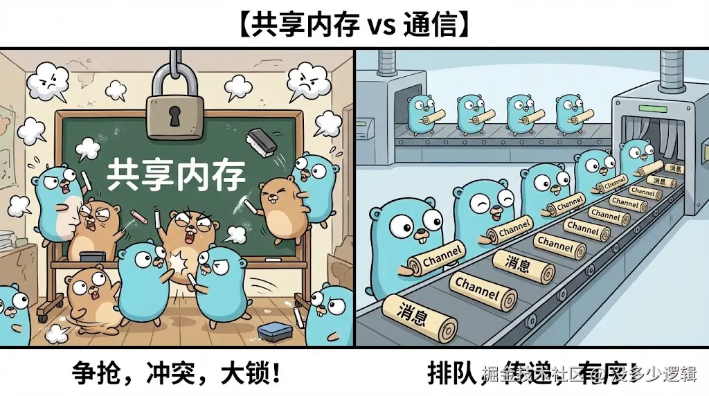 它是什么? 这是 Go 并发最核心的座右铭。与其让多个 Goroutine 去争抢同一块内存(加锁),不如让数据在 Goroutine 之间传递(Channel)。