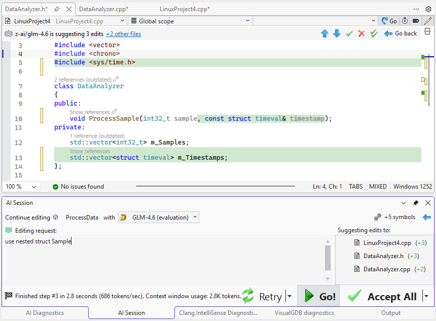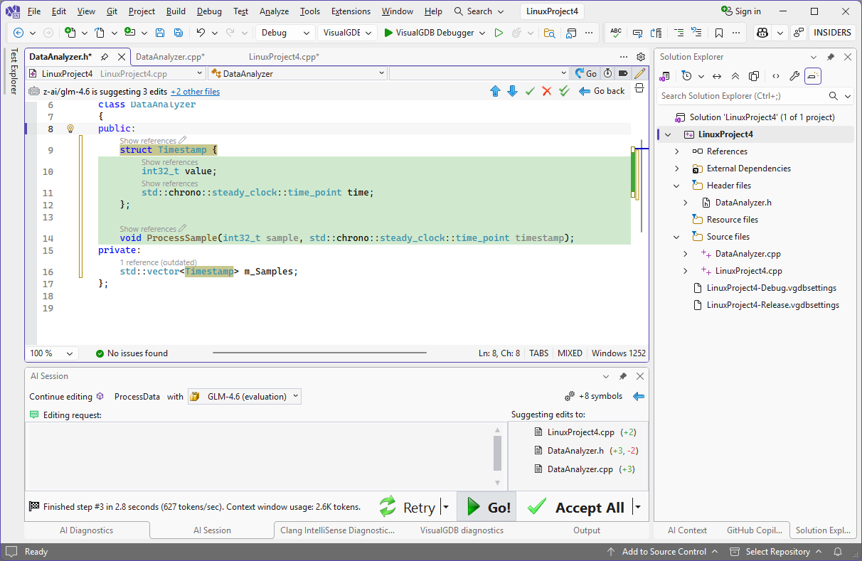 VisualGDB 内置一款高速AI编辑引擎,专为C/C++项目量身打造,尤其适用于代码上下文分散在多个大型文件中的开发场景。