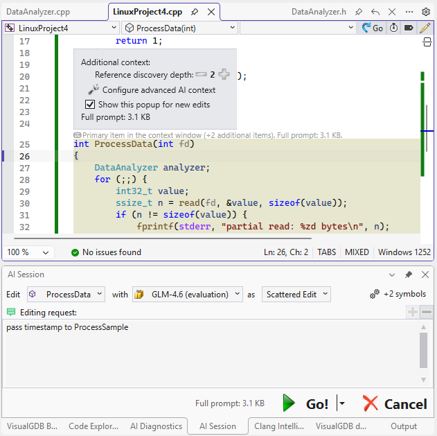 这使得代码编辑能够提升到更高的抽象层级。无需手动修改多处声明,您只需在VisualGDB中定位目标符号,简要描述编辑意图,AI引擎在大多数情况下都能准确完成任务: