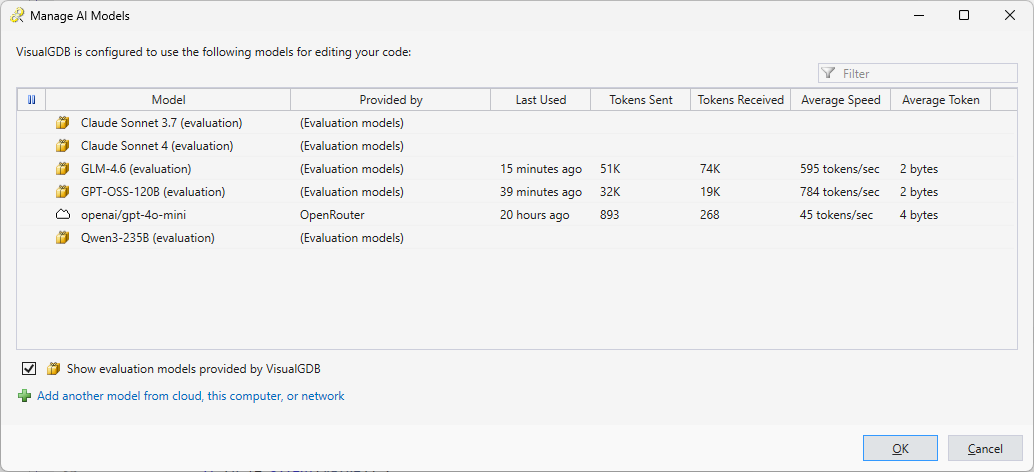 VisualGDB为常用模型提供有限数量的体验令牌。建议生产环境中通过OpenRouter平台创建账户,该平台集成各大厂商的尖端模型服务。您亦可从Cerebras Cloud或其他支持OpenAI风格API的模型提供商处获取限额免费令牌。