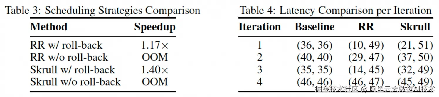 同时,我们测试了不同BatchSize和BucketSize设定对于性能的影响、更大尺寸模型以及高效微调方法Lora的兼容性(如下图所示)。进一步的消融实验和分析(如下表所示)展示出Skrull的启发式策略以及回滚机制对于性能提升的重要性。