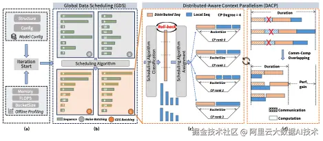 为了保持长文本处理能力同时提升短文本的训练效率,Skrull在每个iteration动态地将训练数据分为两组(分布式计算的数据组和局部计算的数据组)。分布式计算组如同上下文并行的机制一样,将训练数据切分到不同的GPU上计算,并通过通信传输attention计算所需的Key/Value Cache。局部计算的数据将被完整分配到上下文并行组的某个GPU上,以避免额外的通信和提升计算效率。于此同时,由于两组计算没有依赖性,分布式计算的通信时间可以与局部计算重叠,进一步提升性能。