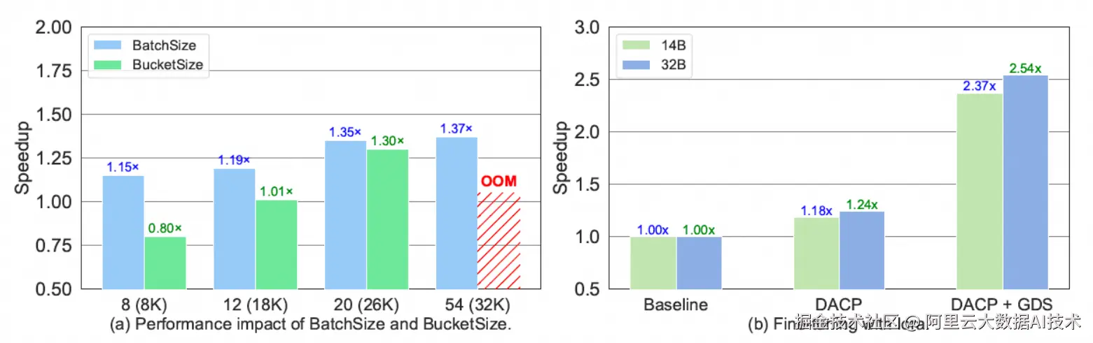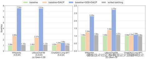 在多种尺寸的Qwen系列模型中验证系统收益。选取了三个数据集,分别代表常见的长尾和双峰分布。(注:前两个数据集不是专用于长文本微调场景但是其数据分布与该场景极为相似)。下图展示了在不同配置下Qwen-0.5B和Qwen-7B相对于DeepSpeed(Zero-2)和简单排序(sorted batching)均取得了显著的加速。