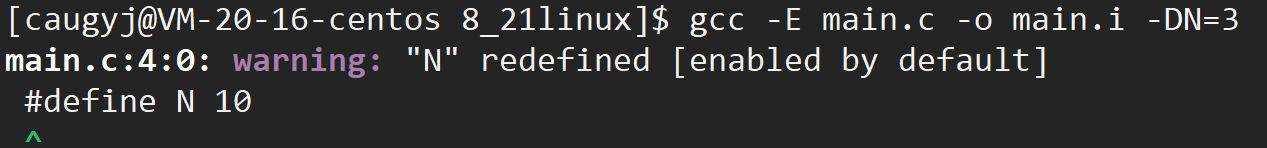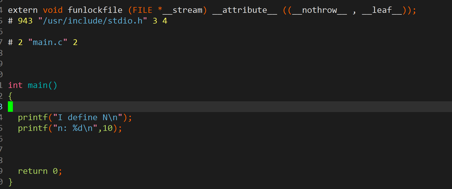 上文讲了gcc是可以带选项的!gcc -E main.c -o main.i -E的作用就是预处理后停止, -o目标文件的名字, .i为规定的后缀,也就是预处理过后的C语言程序。我们来用个代码实验一下