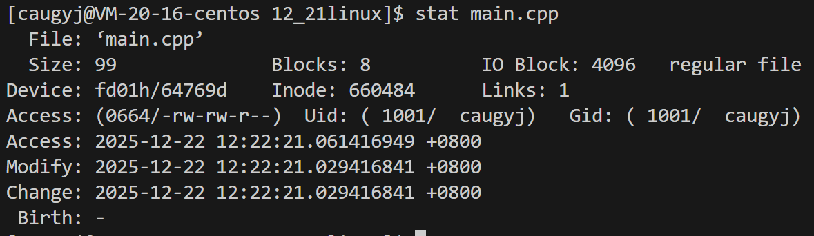 Blocks:实际分配大小,size是99,不满4kb,分配了4kb,Blocks * 512是字节数,也就是4096字节,4kb。当然这两个不是重点,重点看接下来显示出的三个时间戳,Access,Modify,Change。
