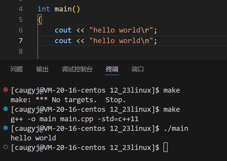 为什么我输出了两个hello world只显示出来一个呢?就是因为\r 只是回车,然后第二个hello world,将原来的hello world进行了覆盖!再来看一个现象: