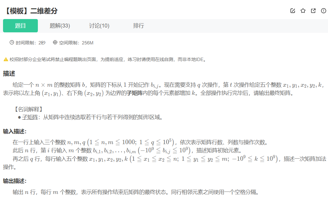 二维差分介绍:二维差分是一维差分的扩展,用于高效处理二维数组的矩形区域批量更新,核心目标是将矩形区域的加 / 减操作从 O(nm) 的时间复杂度优化为 O(1),常与二维前缀和配合使用,广泛应用于矩阵区间修改、图像处理等场景
