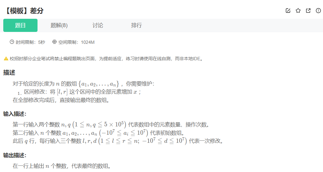 一维差分介绍:一维差分 是一种用于高效处理数组区间更新与查询 的技巧,其核心思想是通过构造一个差分数组,将对原数组的区间批量修改 操作转化为差分数组的单点修改 ,从而将时间复杂度从 O(n) 优化到 O(1),常与前缀和配合使用
