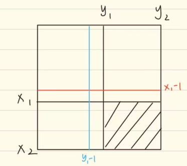 在计算此阴影部分的面积,我们应该利用[x1-1,y2][x2,y1-1][x1-1,y1-1]这三个点;因为以[x1-1,y2]与[x2,y1-1]位置为右下角的两个部分有重叠部分,多减的部分要加回来,即以[x1-1,y1-1]为右下角部分面积,由此我们可以推出公式: