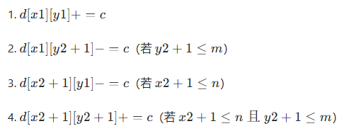 f[x1][y1]+=k;f[x1][y2+1]-=k;f[x2+1][y1]-=k;f[x2+1][y2+1]+=k;