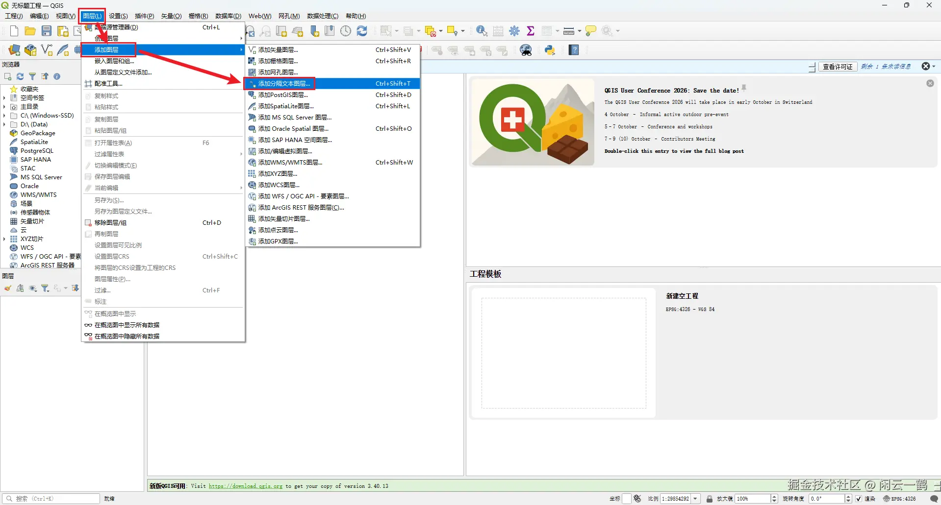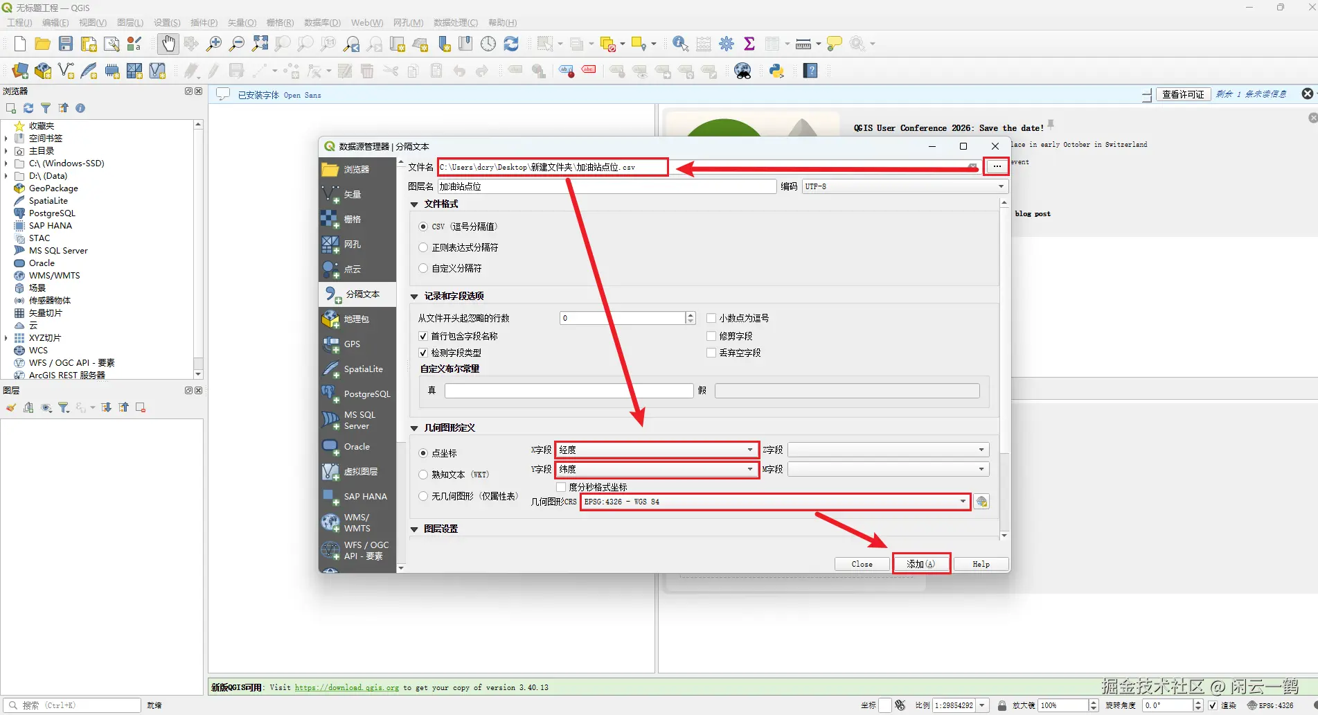 操作步骤:打开QGIS -> 图层 -> 添加图层 -> 添加分隔文本图层 -> "文件名"输入框点击后面的三个点选中文件 -> "几何图形定义"下面的"点坐标"将 X字段选中经度,Y字段选中纬度 -> "几何图形CRS"选中"EPSG:4326 - WGS 84" -> 点击添加
