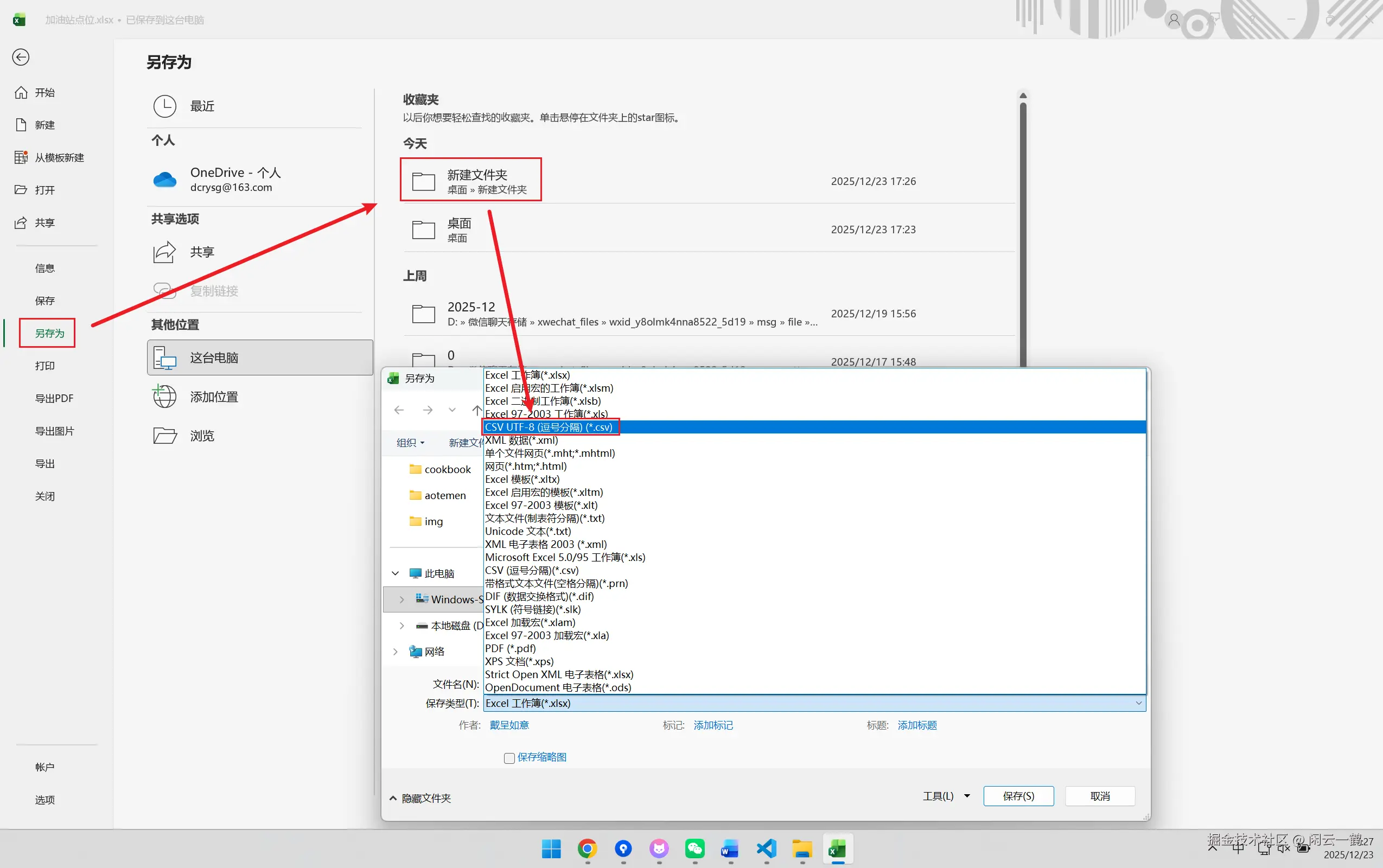 操作步骤:文件 -> 另存为 -> 选择保存目录 -> 保存类型选择`CSV UTF-8(逗号分隔)(*.csv)` -> 点击保存