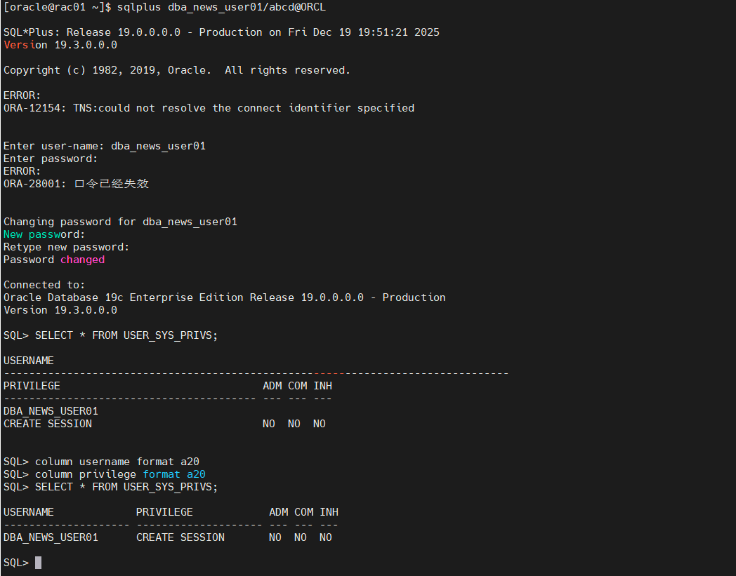 示例1:在SQL*Plus中创建以口令方式验证的用户dba_news_user01
