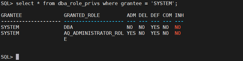 select * from dba_role_privs where GRANTEE = 'SYSTEM';